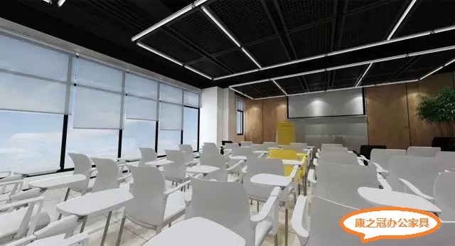 培训室培训桌椅干净利落,简单的线条贯穿,通透的大落地玻璃窗,天花透光软膜的运用,使整个办公空间的办公桌椅更加柔和,不仅增添了明亮视觉感受,也让培训员工可一直保持注意力。
